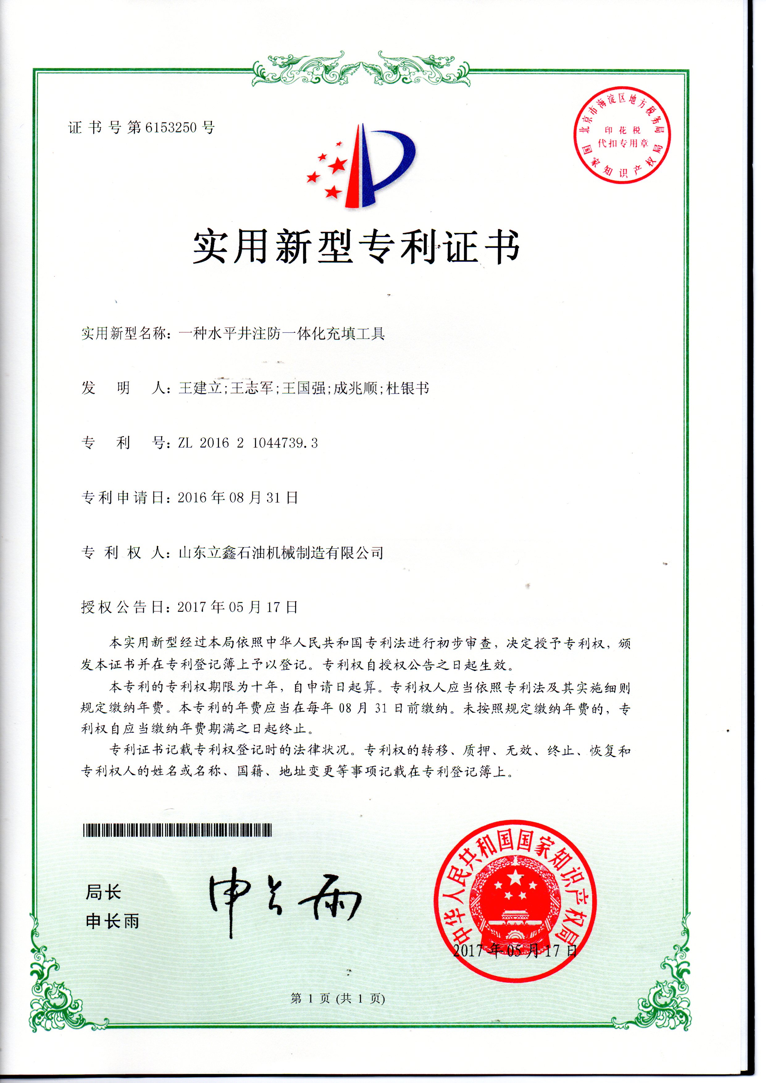 水平充填工具,是我公司科研人员在油田高级首席专家和高级工程师等领导的指导帮助下,开发的一种新型防砂、补砂、注汽为一体的专利产品,专利号:ZL 2016 2 1044739.3